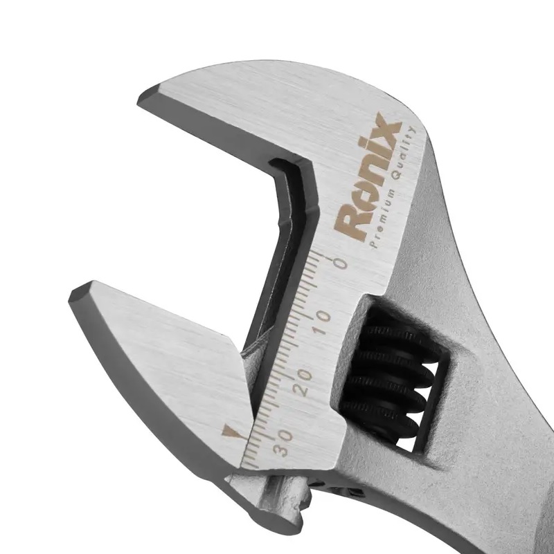 این آچار فرانسه از جنس فولاد مرغوب دراپ فورچ با روکش ساتن کروم تولید شده و دارای فک های سخت کاری شده است تا دوام خود را در شرایط فشردهی کاری به خوبی حفظ کند.پیچ تنظیم فک متحرک این ابزار دستی به گونه ای طراحی و ساخته شده تا بالاترین میزان دقت و کیفیت را برآورده کند.نکتهی مهم دربارهی درجه بندی بر روی فک ثابت این آچار فرانسه روکش دار این است که در یک طرف آن درجهبندی بر اساس واحد متریک (سانتی متر) و در طرف دیگر بر حسب واحد انگلیسی (اینچ) انجام شده است. دهانهی این آچار تا میزان حداکثر ۳۰ میلی متر یا ۱ و ۱/۴ اینچ باز میشود.این ابزار دستی که طراحی آن توسط شرکت رونیکس ثبت اختراع شده، بر اساس استاندارد ANSI (موسسهی استاندارد امریکا) تولید و عرضه میشود.از این آچار فرانسهی 25 سانتی متری و 430 گرمی میتوانید به خوبی و آسانی برای باز کردن مهرهها و پیچهای چهارگوش یا ششگوش استفاده کنید.آچار فرانسه ۱۰ رونیکس ساخت شرکت رونیکس و کشور چین است.
